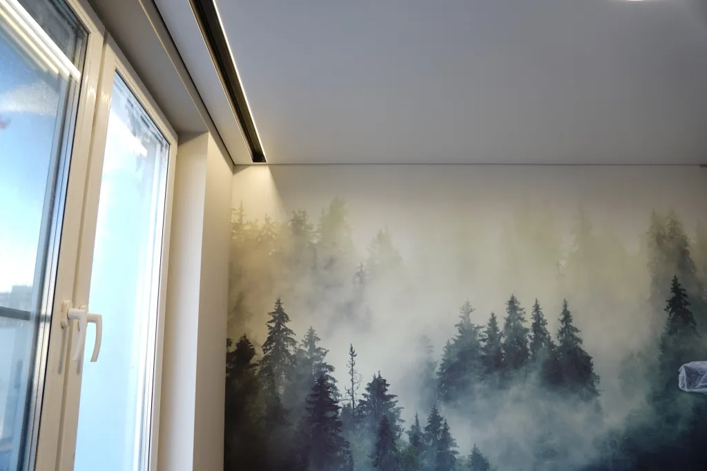 - Видом фактуры. Она может быть глянцевой, матовой, сатиновой. Если хотите больше глубины, эффект расширения пространства, выберите глянец. Для благородного блеска — сатин. Для более классического интерьера — матовую поверхность. Также доступны фактуры с имитацией дерева, бетона и других материалов.