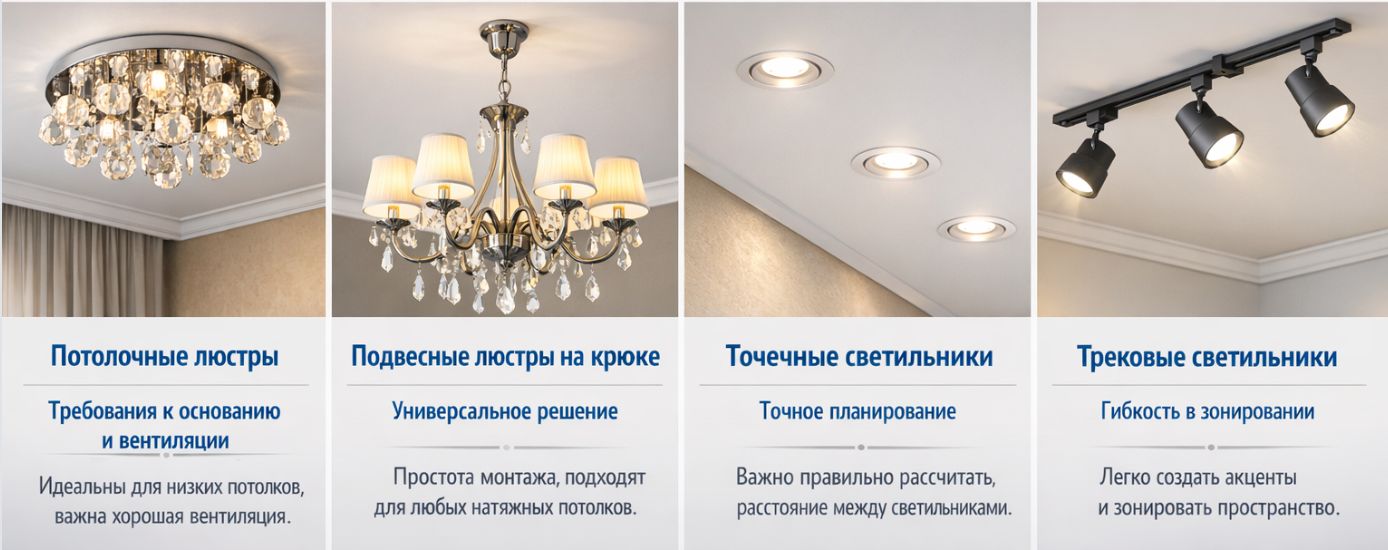 Типы оснований и конструкций для крепления люстры и светильника на натяжном потолке
