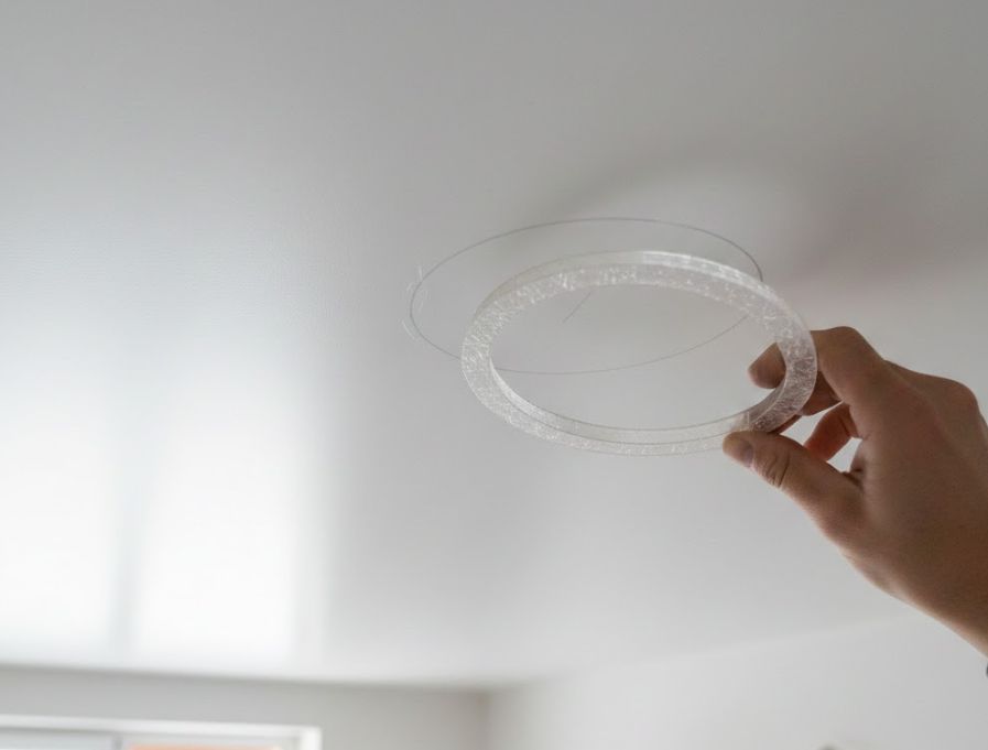 После установки натяжного потолка на место будущего отверстия приклеивается специальное термокольцо. Оно защищает натяжное полотно от разрыва и перегрева.