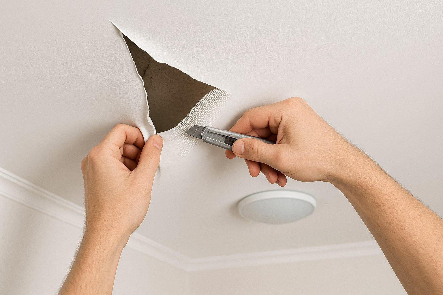 До ремонта пореза необходимо заклеить его края малярным скотчем. Он закрепит их и предотвратит увеличение повреждения потолка в размерах. Помните, что возможность восстановления целостности поверхности потолка напрямую зависит от размеров повреждения.