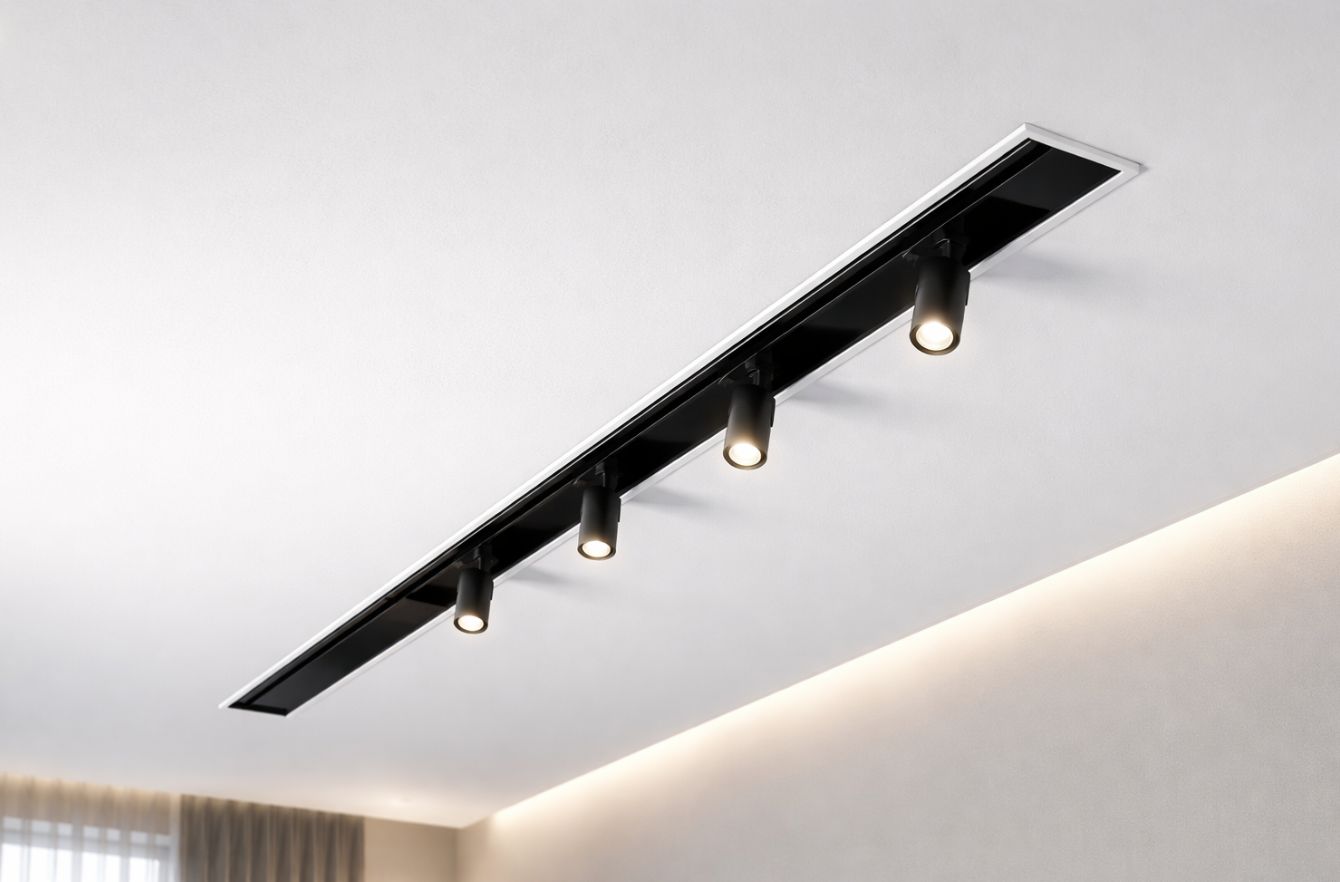 Суть: трек ставят в специальный профиль, который формирует нишу в потолке (часто — с «теневым» примыканием). Корпус утапливается, остаётся тонкая линия без выступающих элементов.