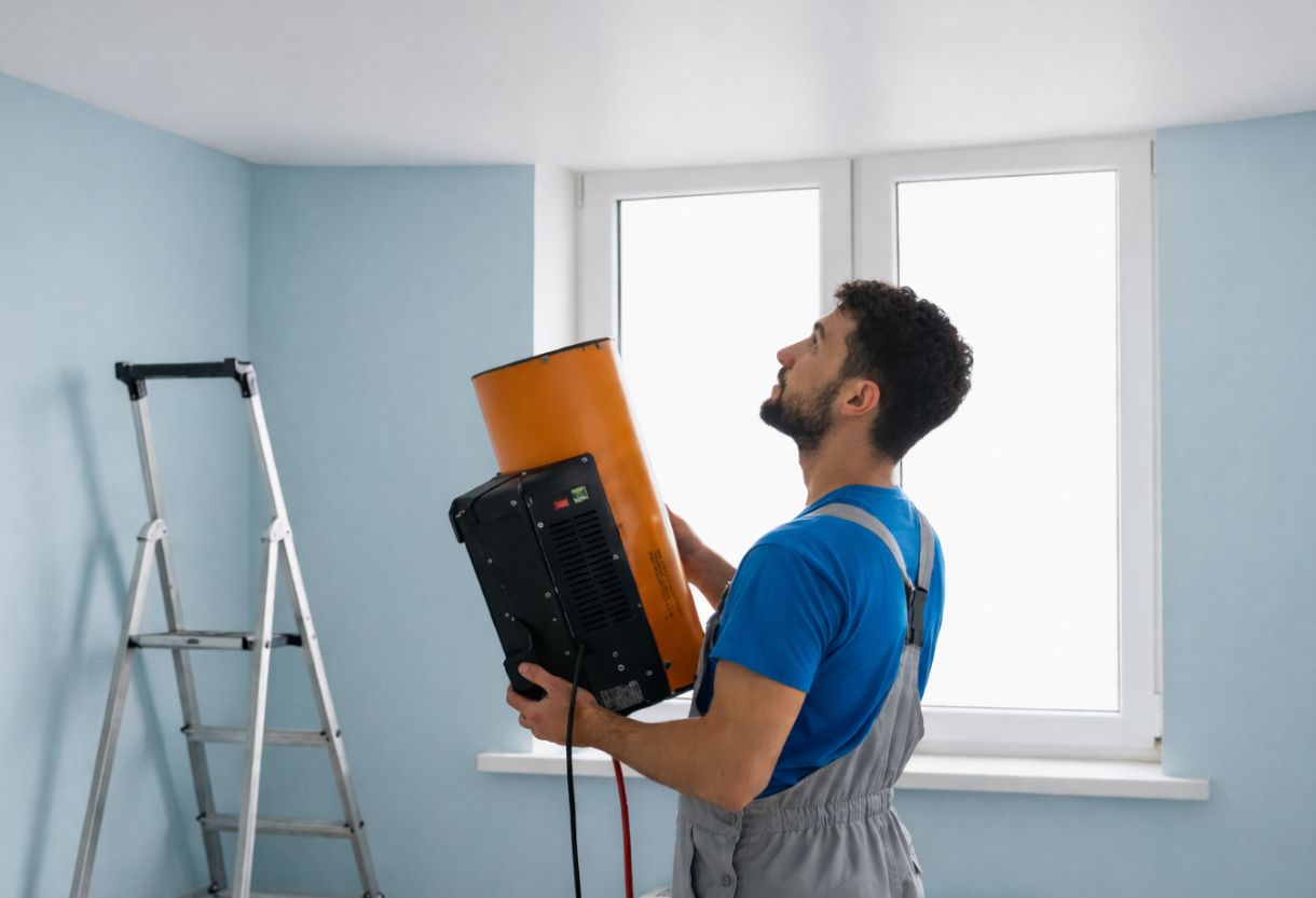 Для монтажа используют тепловые пушки — чаще газовые или электрические. Их задача — прогреть комнату и полотно равномерно, без точечного «обжига».